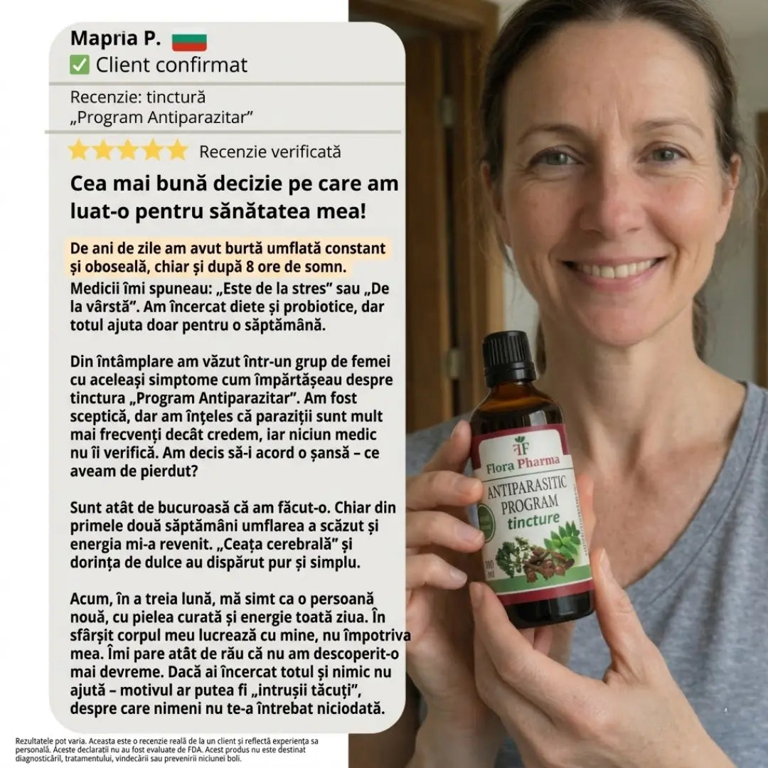 Am încercat totul pentru oboseala constantă și balonarea stomacului - probiotice, diete, enzime, chiar și ceaiuri „detox”. Totul m-a ajutat doar pentru o săptămână sau două. De când am început „Programul anti-paraziți”, simt o diferență reală pentru prima dată în ani de zile. Balonarea a dispărut. Mi-am recăpătat energia. Stomacul meu este în sfârșit calm. S-a dovedit că problema nu era dieta mea. Era ceva despre care niciun medic nu m-a întrebat vreodată.